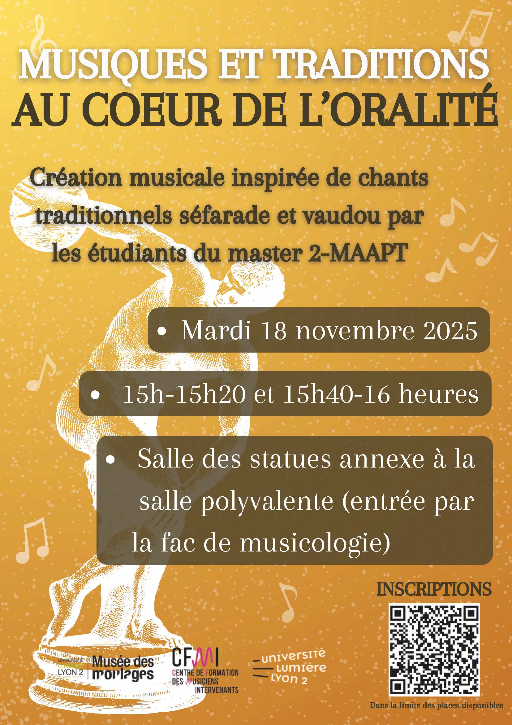Entre tradition et création, les étudiants en Master 2 MAAPT du CFMI de l’Université Lumière Lyon 2 vous invitent à découvrir une pièce musicale et sonore inspirée des chants séfarades et culte vaudou, où voix, instruments et percussions s’entrelacent dans un dialogue vibrant.Rendez-vous dans la salle des statues annexe à la salle de cours, le mardi 18 novembre dans l’après-midi, pour un moment hors du temps, à la croisée des musiques anciennes et des sonorités d’aujourd’hui.