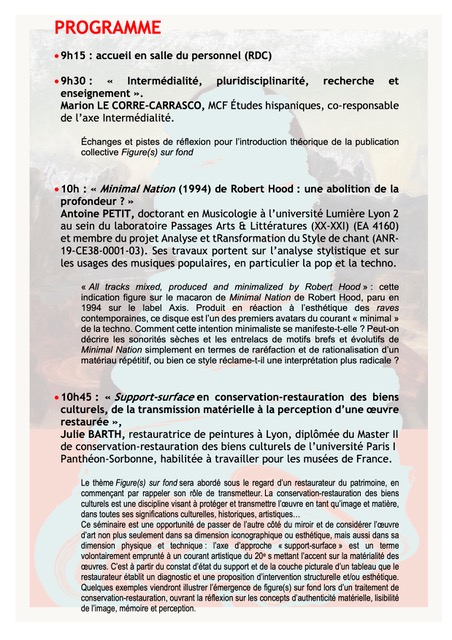 Ce séminaire est une opportunité de passer de l’autre côté du miroir et de considérer l’œuvre d’art non plus seulement dans sa dimension iconographique ou esthétique, mais aussi dans sa dimension physique et technique : l’axe d’approche « support-surface » est un terme volontairement emprunté à un courant artistique du 20e s mettant l’accent sur la matérialité des œuvres. C’est à partir du constat d’état du support et de la couche picturale d’un tableau que le restaurateur établit un diagnostic et une proposition d’intervention structurelle et/ou esthétique. Quelques exemples viendront illustrer l’émergence de figure(s) sur fond lors d’un traitement de conservation-restauration, ouvrant la réflexion sur les concepts d’authenticité matérielle, lisibilité de l’image, mémoire et perception.