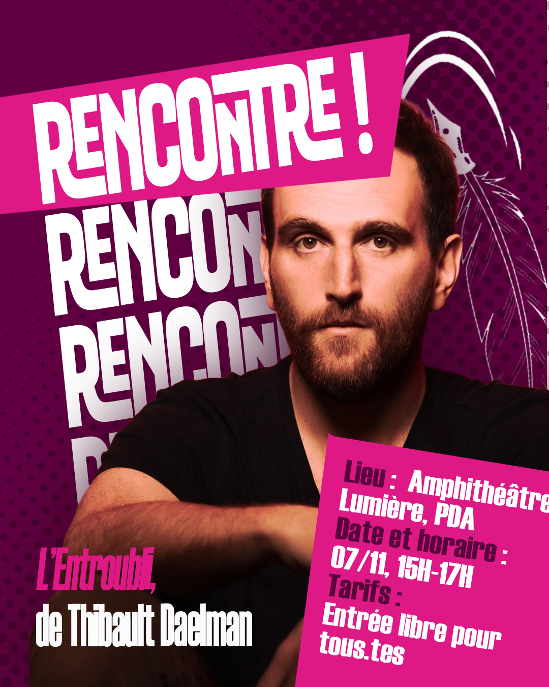 Cette rencontre est organisée par le département des Lettres dans le cadre de la participation des L1 au prix Roman des étudiants (France Culture), dont Thibault Daelman est l'un des nominés.